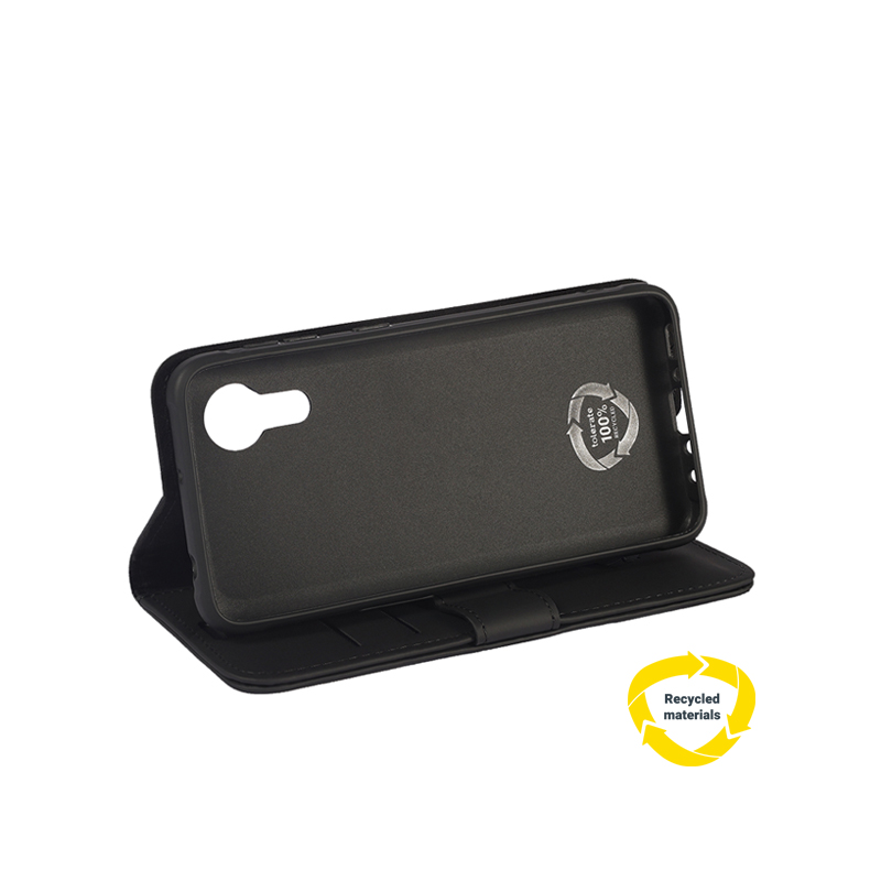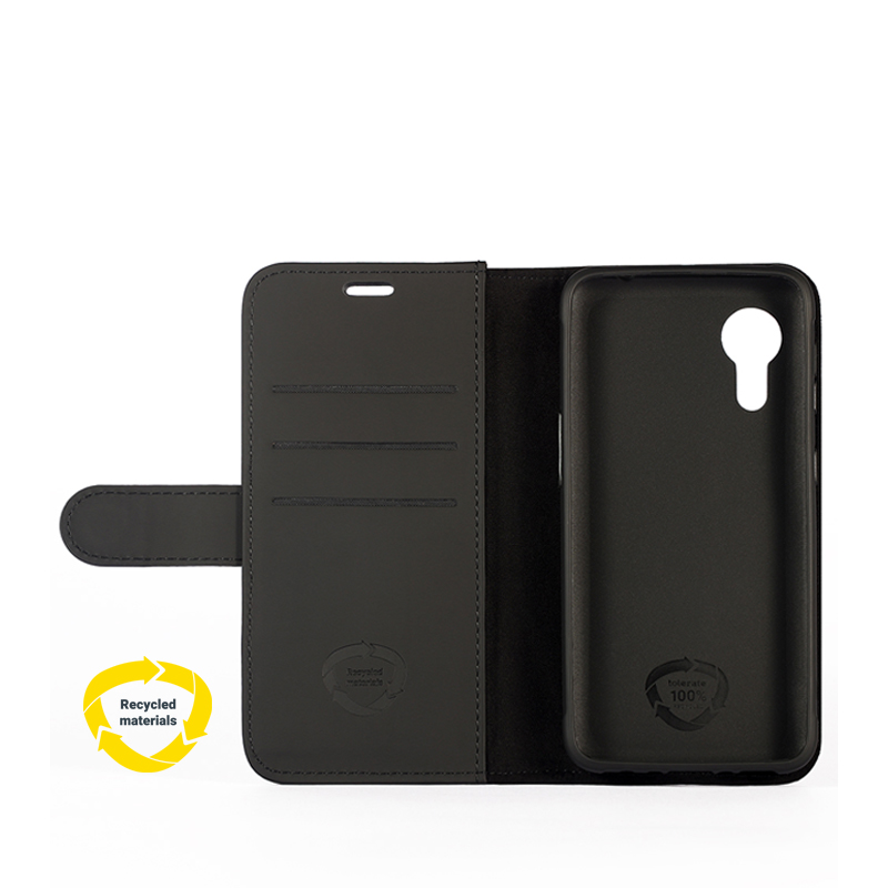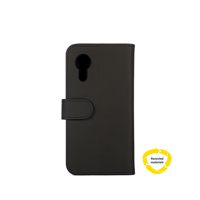 The protective shell on the inside is made of 100% recycled TPU, and the outer wallet case is made from at least 50% recycled material.